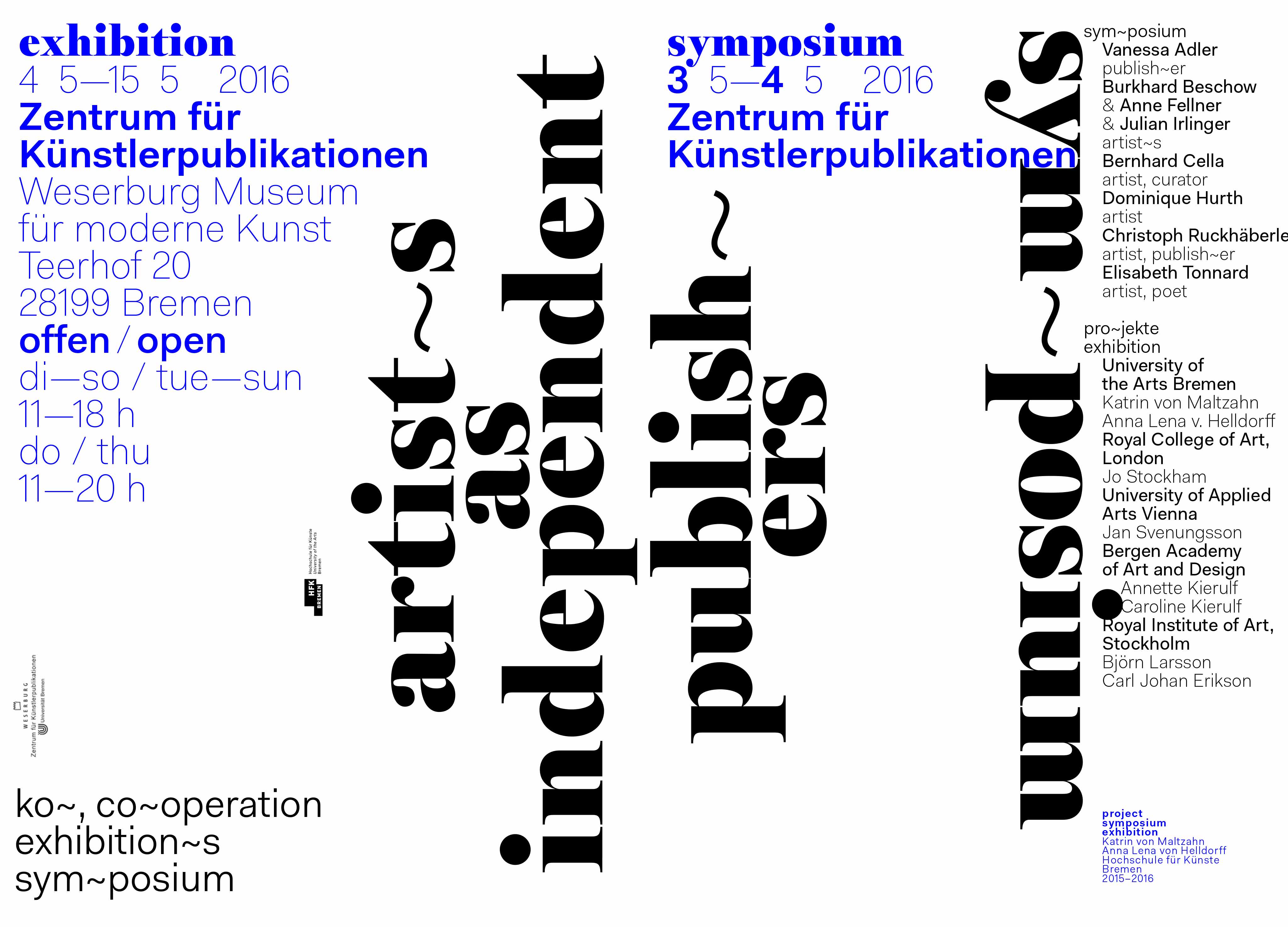 As of May 2016 the project will lead to joint exhibitions in Bremen, Bergen, Vienna, Stockholm and London, kicked off by a symposium as well as an exhibition in collaboration with the Centre for Artists’ Publications in the Museum Weserburg in Bremen.