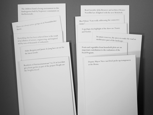The series focuses on the manoeuvring involved when ideas are presented to the public eye with the aim of persuasion. Whether we look at Soviet propaganda or at minor deceits in the local newspaper: things are bent, spun and twisted. The series presents found image-and-caption combinations from books, leaflets and newspapers. Each item in the series is a folded sheet containing a single found image with its caption. The caption is on the front, the image is hidden inside.