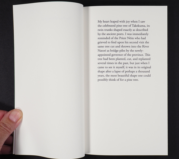I’m pleased to publish a small handmade book I have been working on. It is based on Matsuo Bashō’s Oku no Hosomichi, one of the major texts of classical Japanese literature. Specifically, it traces Bashō’s description of the pine tree of Takekuma, an immortal image that utters itself through several temporary realizations.