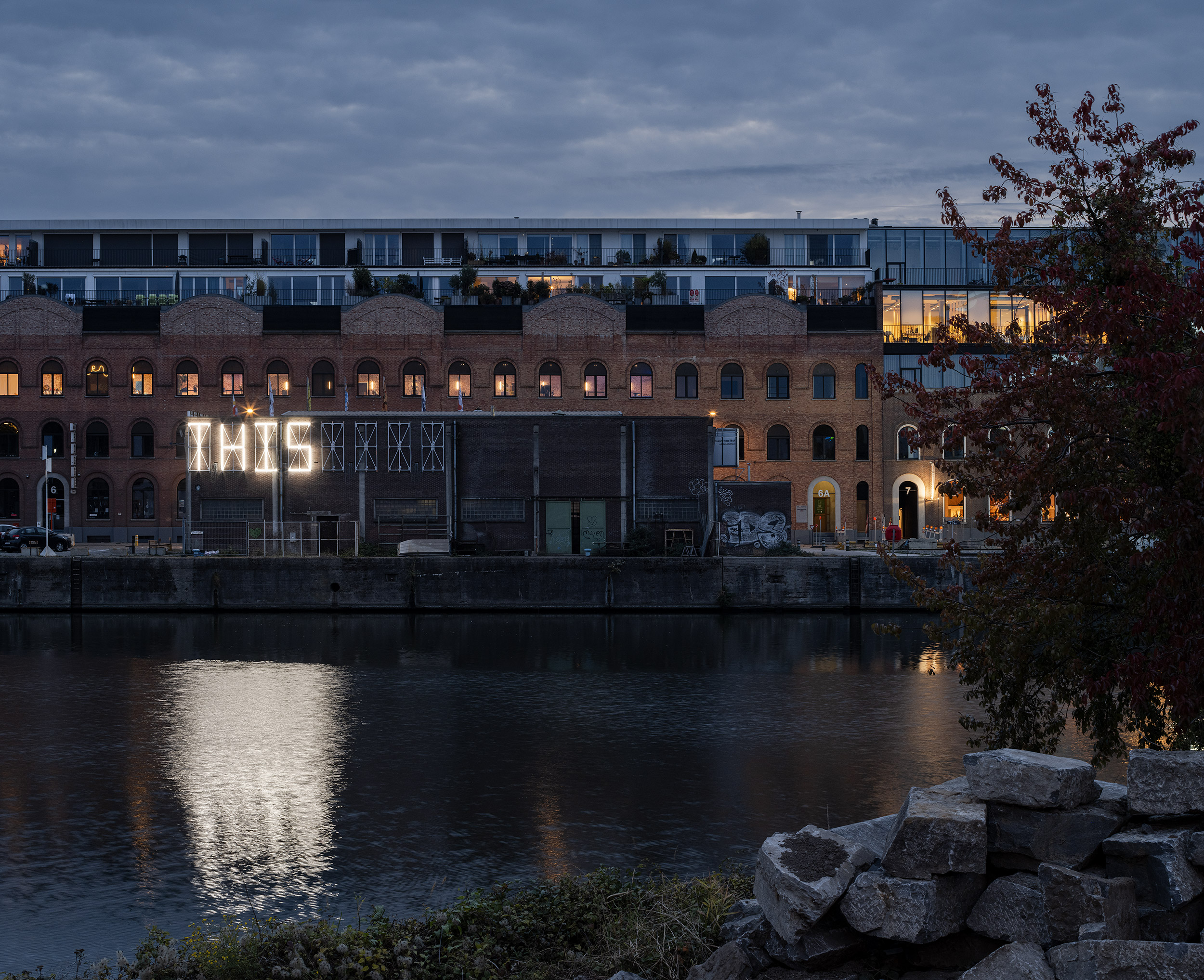 THIS TOO SHALL PASS will launch on October 2nd around 8 PM. It will be on view until November 16th, every evening from sundown until 10 PM, on 019’s eastern facade. The address is Dok-Noord 5L in Gent. It can best be seen from across the dock (Schipperskaai). The work is 10.30 minutes long and runs in a continuous loop. With thanks to the curators, Arnout De Cleene and Michiel De Cleene. The photo above is by Michiel De Cleene.