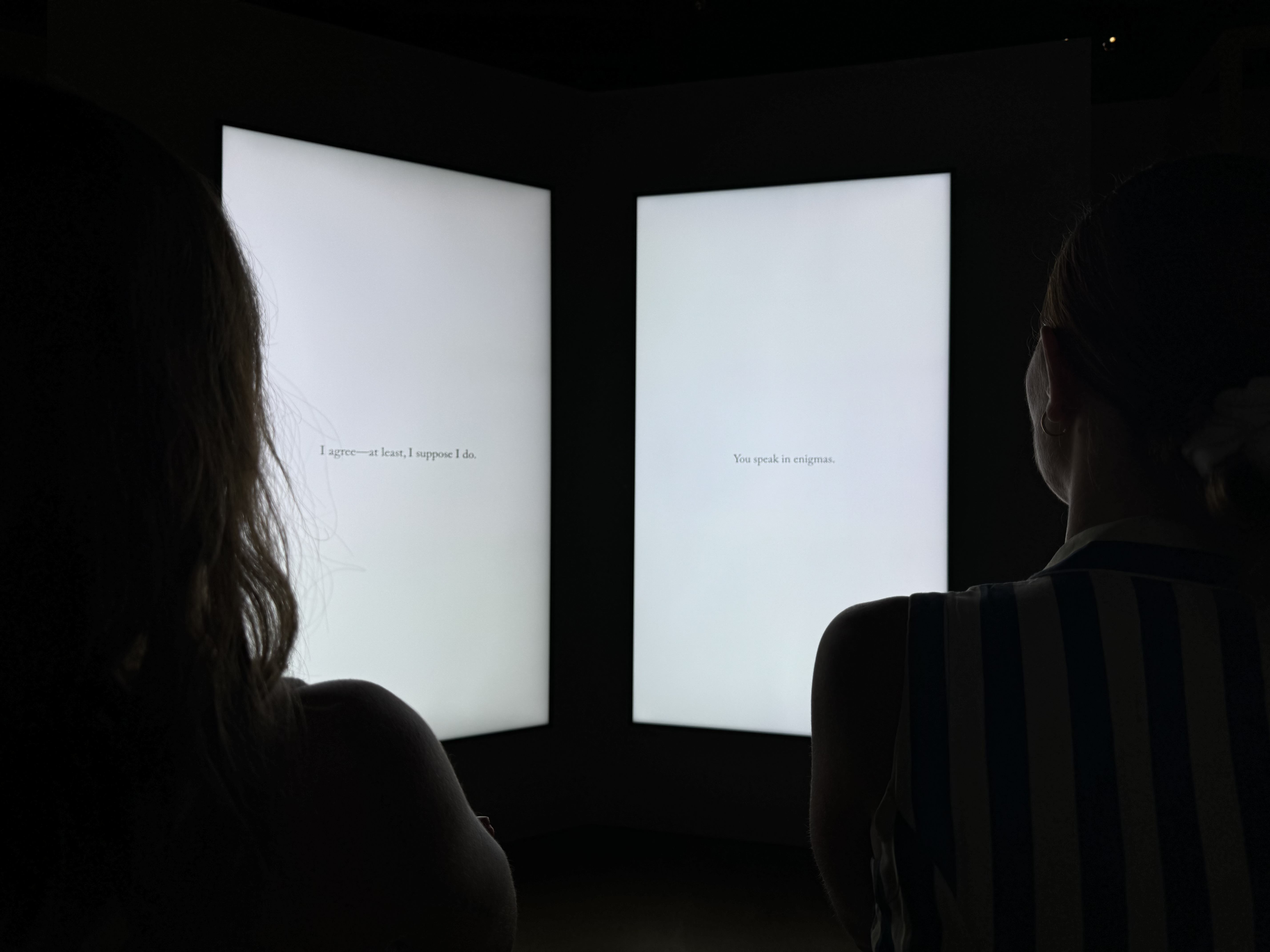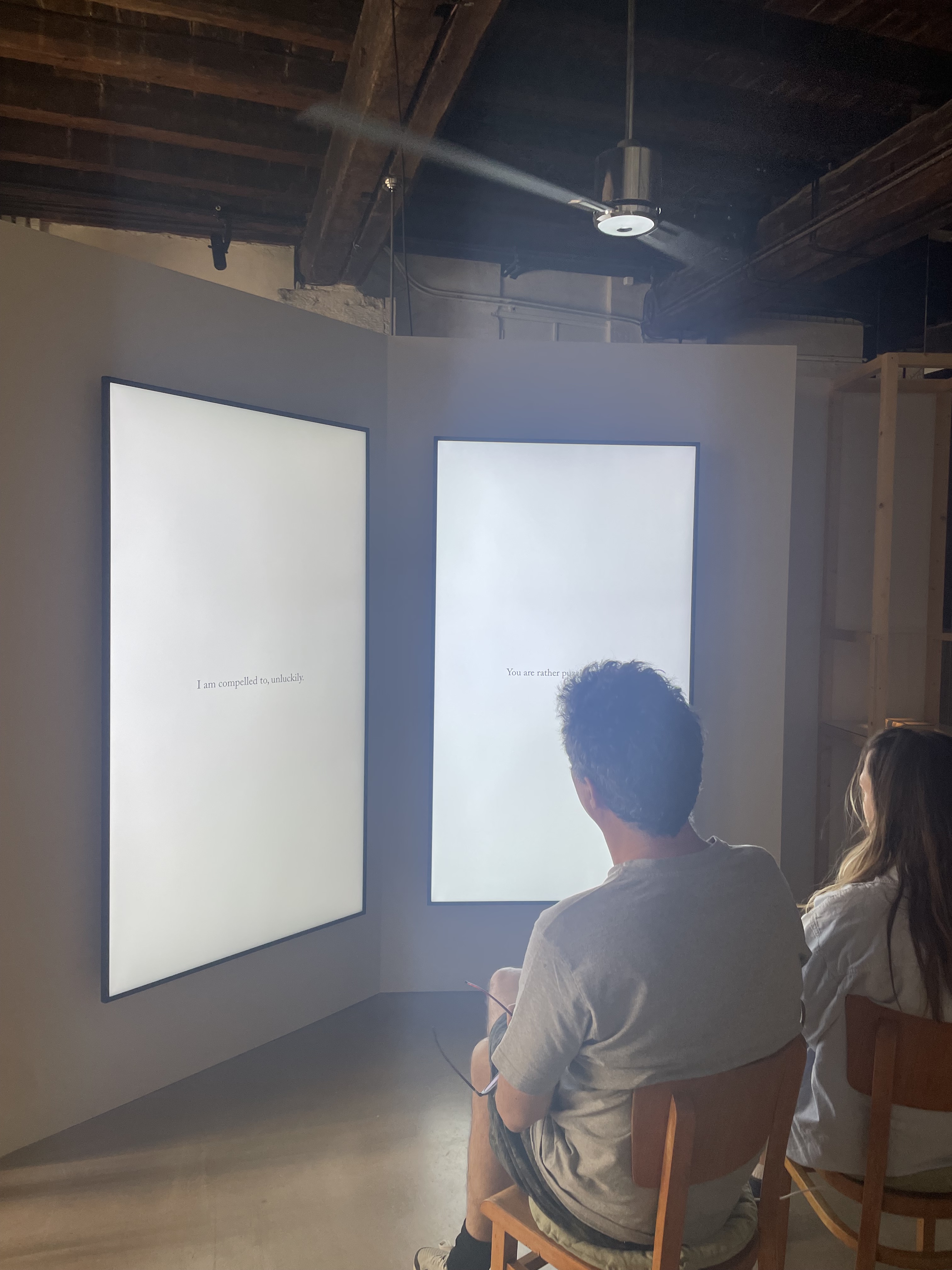 Two chairs invited the audience to be actors in the work. By sitting down, a viewer automatically caused a series of conversational phrases to start appearing (basically a monologue, as if reading only the left pages or only the right pages in the original book). When a second person sat down in the other chair, a second series of conversational phrases started to appear in answer and a dialogue in useful phrases ensued. This serendipitous dialogue of miscommunications was different each time because it was influenced by when exactly each person sat down.