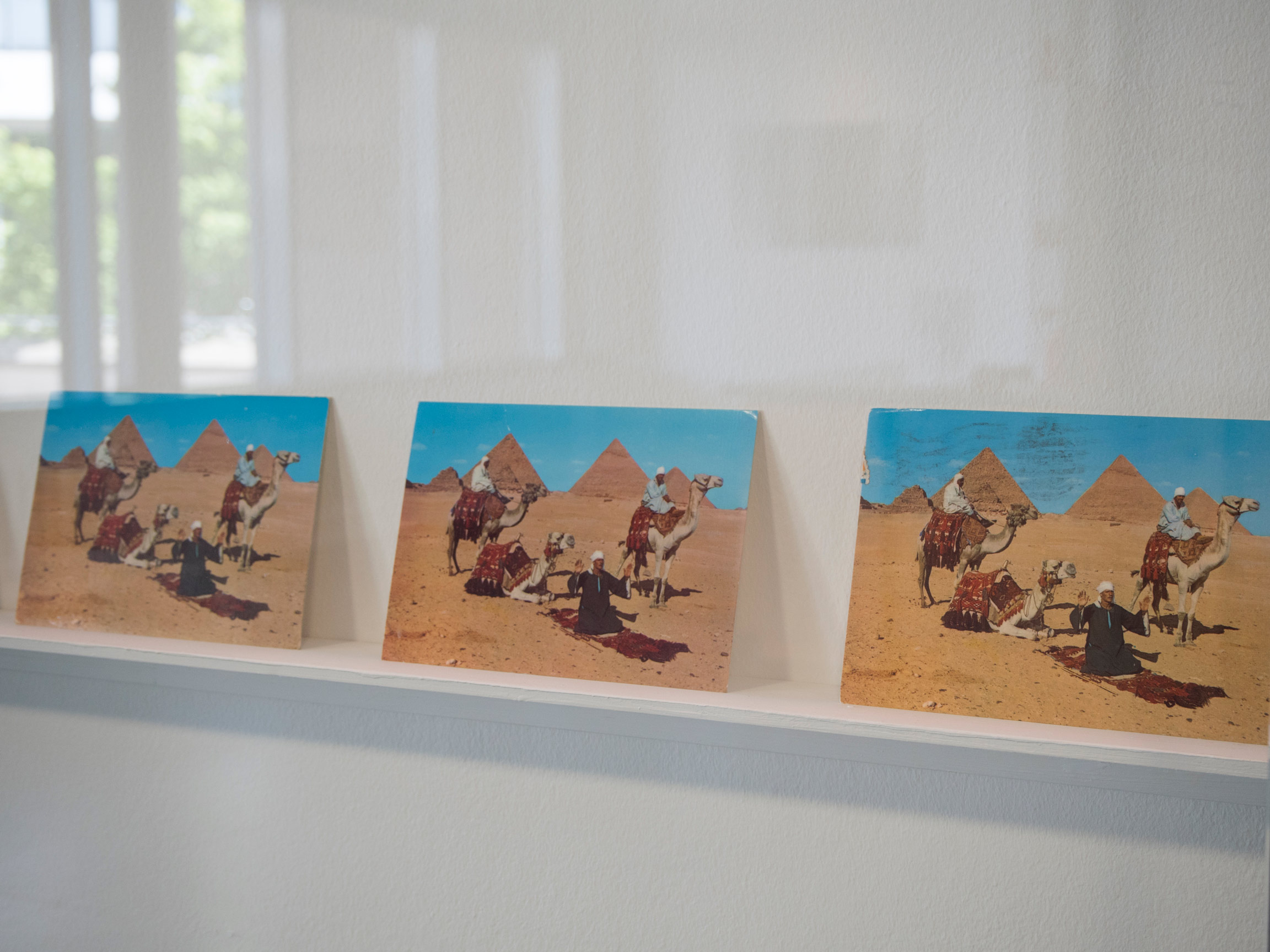 The cards in each series show slight visual differences; the color is changed as a result of age or variations/manipulations in the print runs and sometimes there are visible signs of how the card went through the mail system or was tacked to a wall. The photos are the same but the actual objects and the meaning they had for the senders and receivers are not. The installation is completed by texts in four languages drawn from the backs of the postcards.
