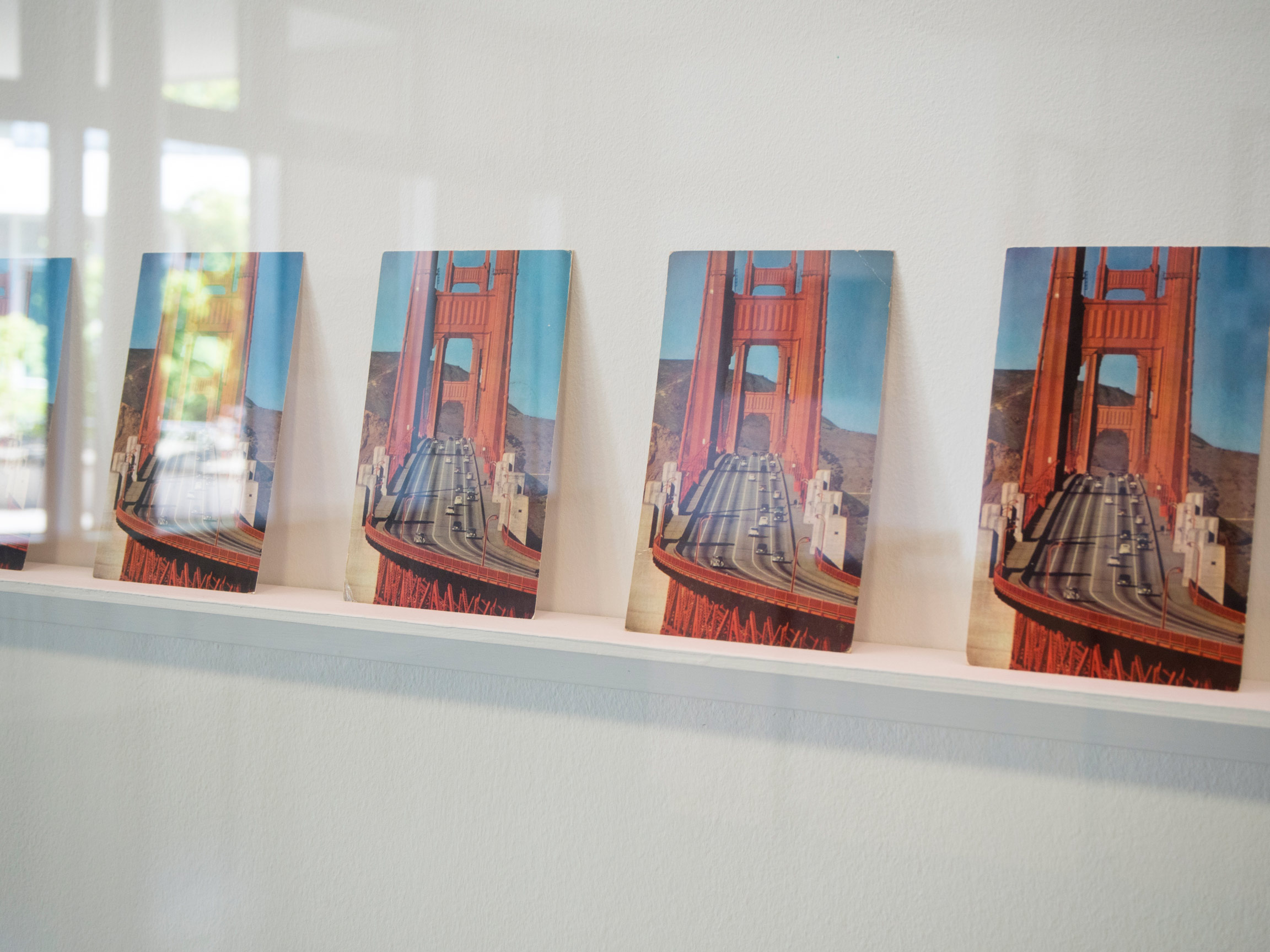 More Than A Few Glimpses Of Its Charms is an installation of found postcards on custom-made shelves and printed texts on paper. The work consists of eighteen different series of found postcards, with each series based on the same photograph. There are eighteen different photographs but together nearly one hundred different used postcards in the installation.