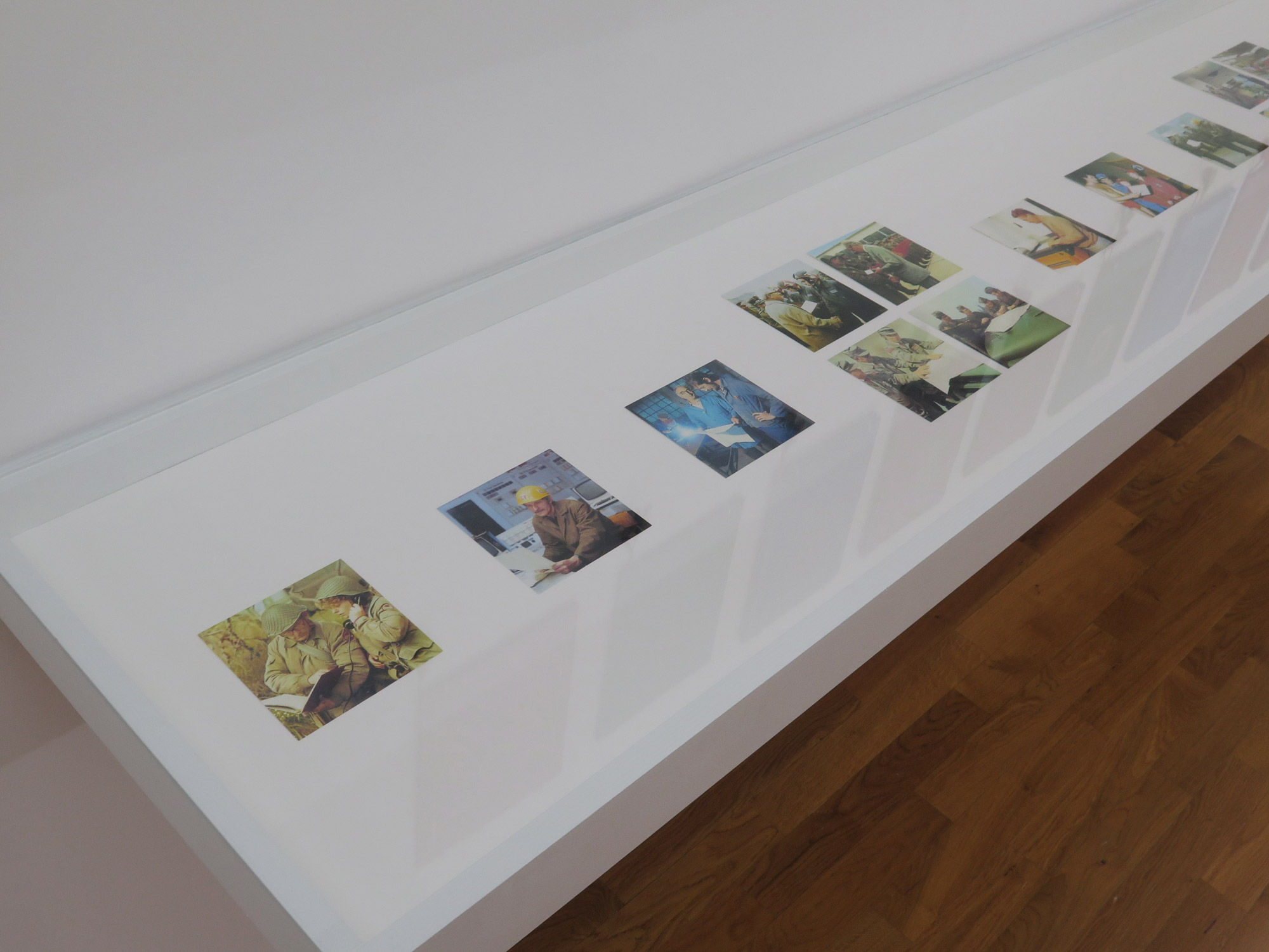 The Plan at Noorderlicht House of Photography in Groningen. Artist book on pedestal, GDR folders, a copy of the Plan in vitrine, slogan on wall.