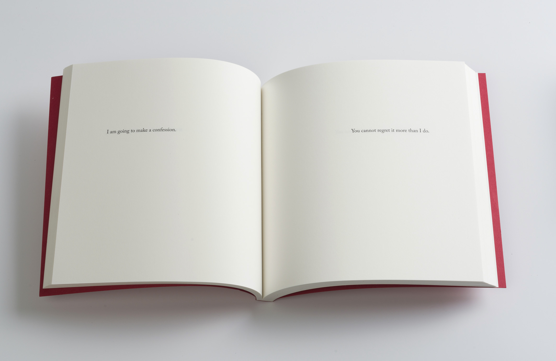 Kleiser’s conversational phrases starting with ‘I’ were taken and placed opposite those starting with ‘you’. The ‘I’ phrases are running in alphabetical order down the verso pages, the ‘you’ phrases down the recto pages. A dialogue is formed from the random meetings of these phrases. It is a dialogue in the purest sense, a dialogue that expresses nothing other than itself. The book has a square format to indicate the empty room where such communications might be taking place.