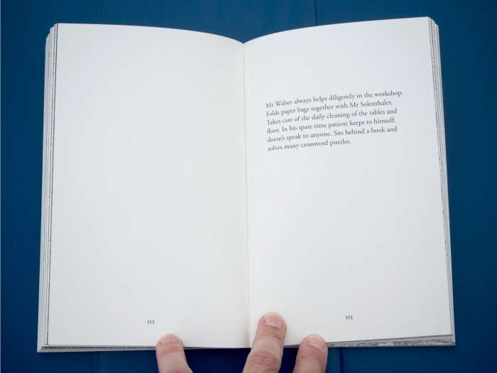 The layout of the book mirrors the repetitive nature of Walser’s days, weeks, years at the clinic – and blank space is treated as a meaningful element.
